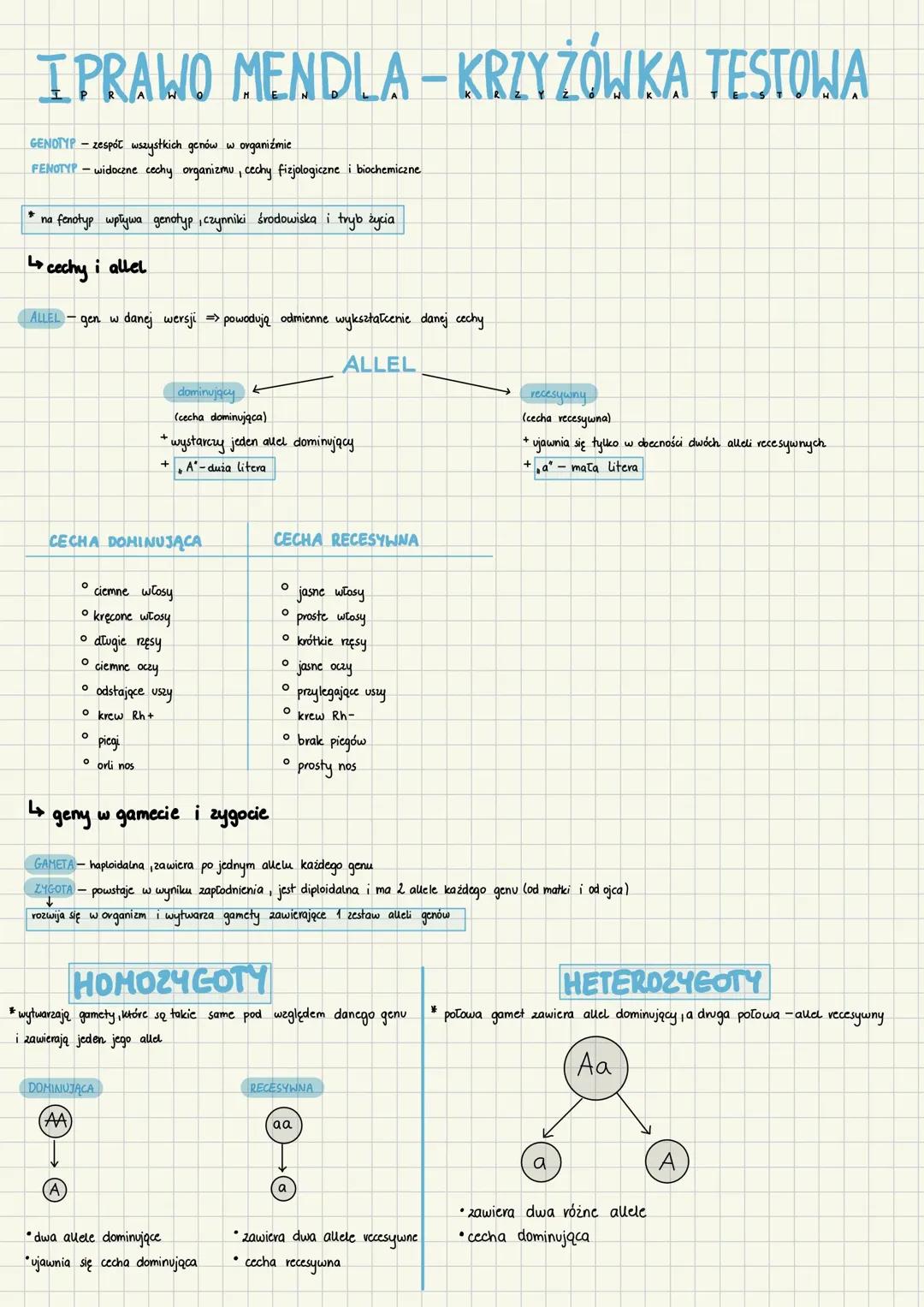 Zrozumienie podstawowych zasad genetyki Mendla, w tym dziedziczenia monogenicznego, alleli, homozygot i heterozygot. Ta notatka zawiera kluczowe informacje o prawie Mendla, w tym przykłady krzyżówek genetycznych oraz analizę fenotypów i genotypów. Idealna dla studentów biologii i genetyki.