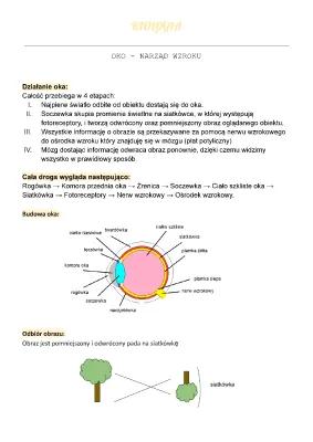 Druga część dokumentu koncentruje się na bardziej szczegółowym omówieniu chorób oczu i zaburzeń widzenia. Jęczmień jest przedstawiony jako częsta dolegliwość, powodowana przez bakterie atakujące gruczoł łojowy na brzegu powieki. Objawy jęczmienia obejmują ból, swędzenie i łzawienie oka, a w przypadku jego wystąpienia zaleca się wizytę u okulisty.