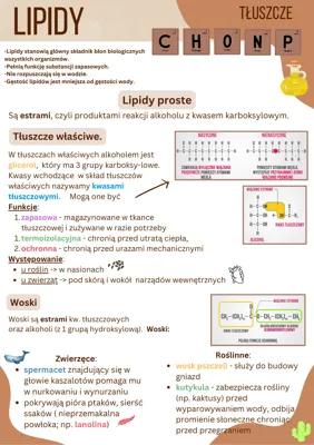 Zrozumienie budowy i funkcji lipidów, w tym fosfolipidów, steroidów i karotenoidów. Dowiedz się, jak lipidy tworzą błony biologiczne, pełnią funkcje energetyczne i ochronne oraz ich rolę w organizmach roślinnych i zwierzęcych. Materiał obejmuje kluczowe pojęcia, takie jak kwasy tłuszczowe, estry i ich znaczenie w biologii. Idealne dla studentów biologii i nauk przyrodniczych.