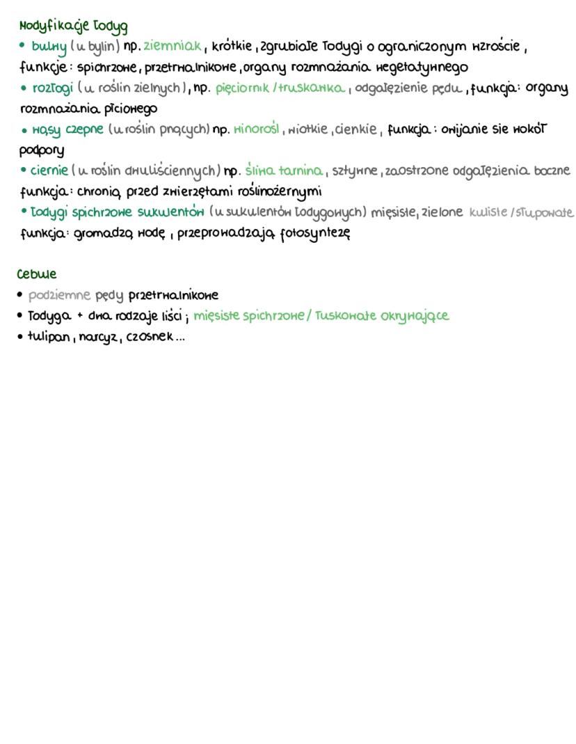 Example: Modyfikacje łodygi i przykłady obejmują bulwy ziemniaka jako organ spichrzowy i wąsy czepne winorośli jako przystosowanie do wspinania się.