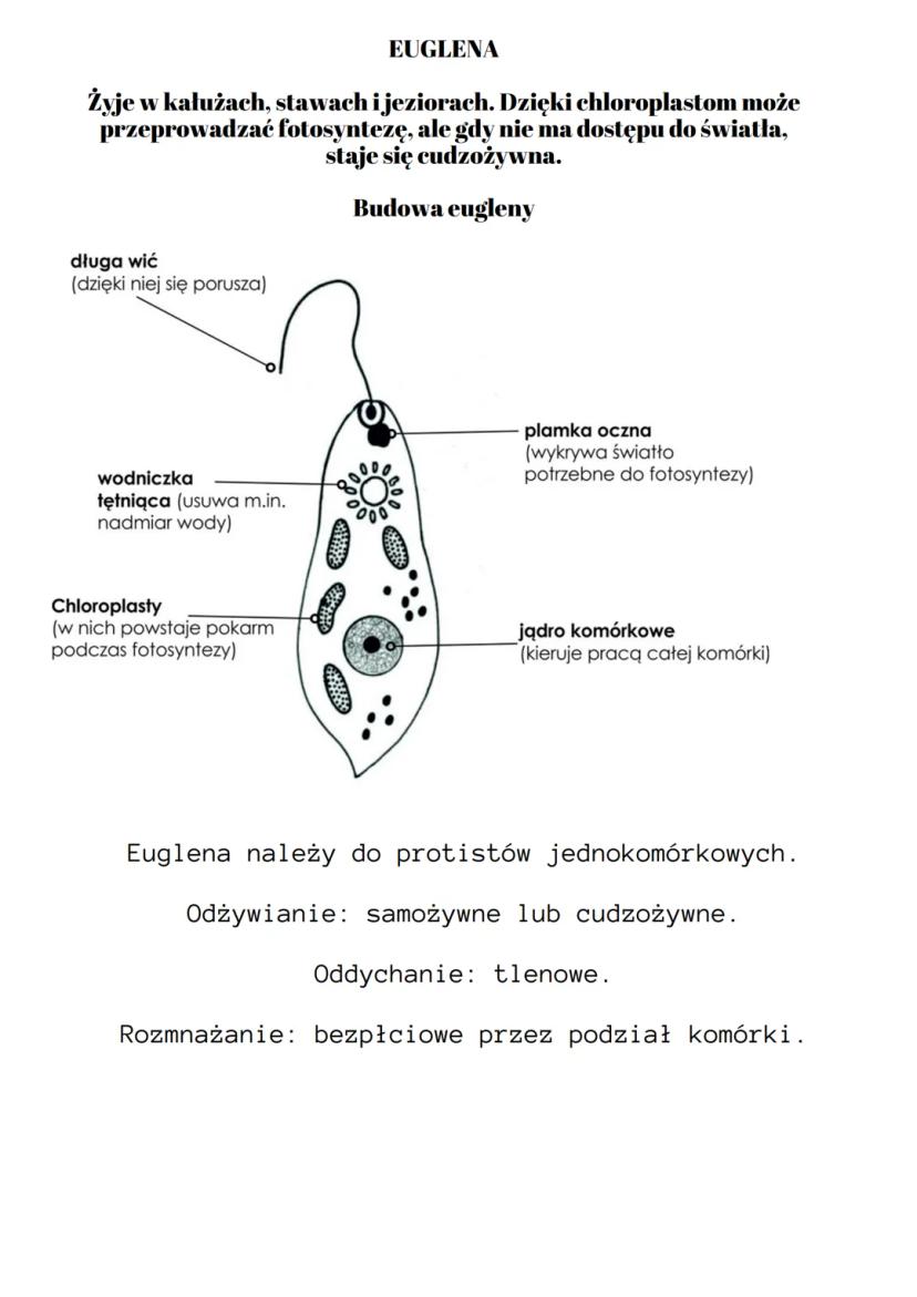 Charakterystyka eugleny zielonej obejmuje również tlenowe oddychanie oraz bezpłciowe rozmnażanie przez podział komórki, co jest typowe dla wielu protistów.