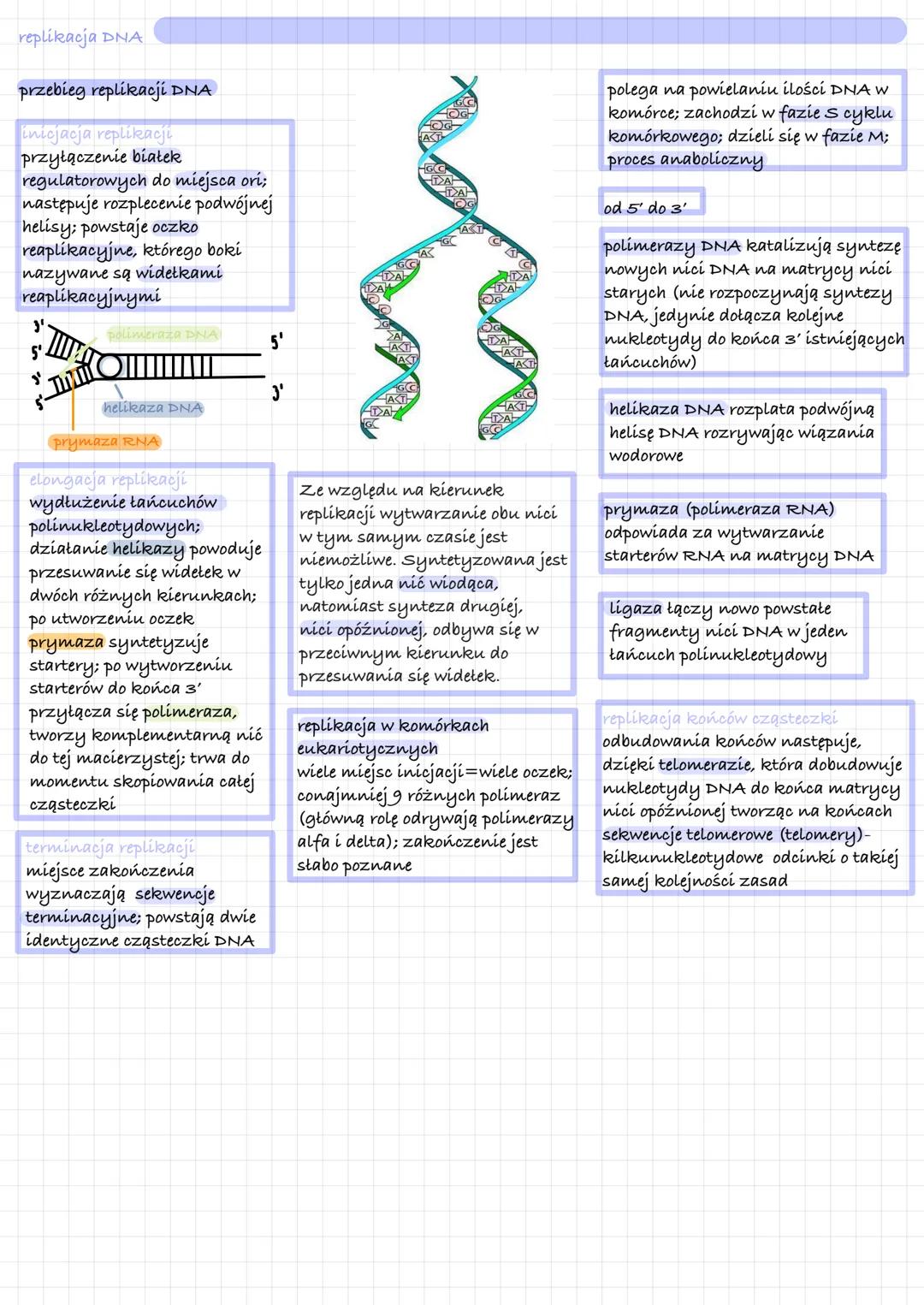 Kluczowe enzymy to polimeraza DNA (dołącza nukleotydy do końca 3'), helikaza (rozplata podwójną helisę), prymaza (tworzy startery RNA) i ligaza (łączy fragmenty DNA w jeden łańcuch).