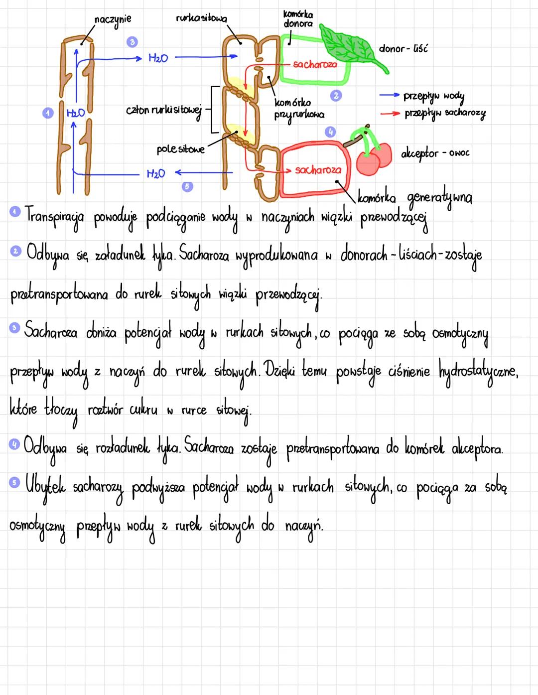 Gdy sacharoza trafia do rurek sitowych (autostradów roślinnych), obniża tam potencjał wody. To powoduje, że woda "ucieka" z naczyń do rurek sitowych, tworząc ciśnienie hydrostatyczne - naturalną pompę, która pcha słodki roztwór do przodu.