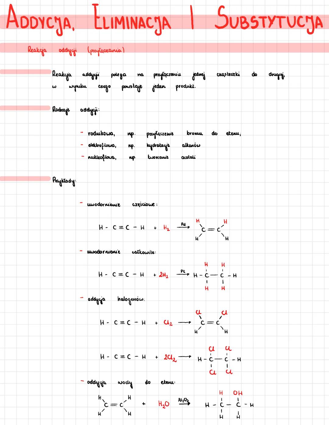 Występują różne rodzaje addycji: rodnikowa (np. przyłączenie bromu do etenu), elektrofilowa (np. hydratacja alkenów) i nukleofilowa (np. tworzenie acetali). W praktyce możesz spotkać się z procesami takimi jak uwodornienie (częściowe lub całkowite), addycja halogenów czy addycja wody.