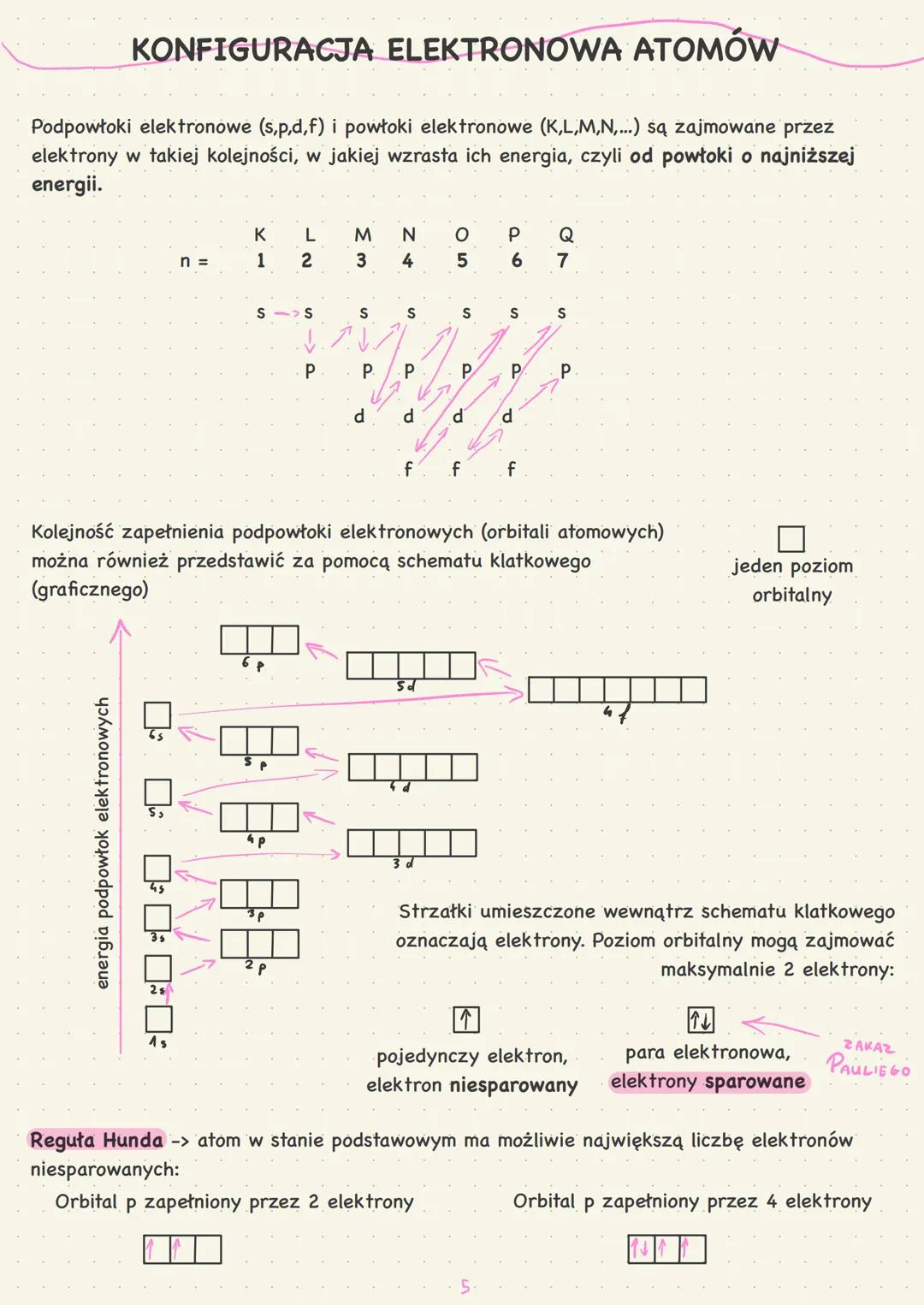 Ważne: Reguła Hunda mówi, że elektrony w podpowłoce najpierw zajmują wszystkie dostępne orbitale pojedynczo, a dopiero później tworzą pary elektronowe.