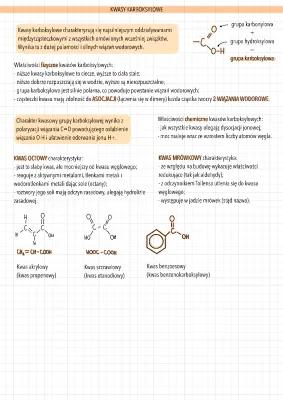Zgłębiaj właściwości fizyczne i chemiczne kwasów karboksylowych, w tym ich polarność, zdolność do tworzenia wiązań wodorowych oraz charakter kwasowy. Dowiedz się o specyficznych kwasach, takich jak kwas octowy i mrówkowy, oraz ich reakcjach. Idealne dla studentów chemii. Typ: podsumowanie.