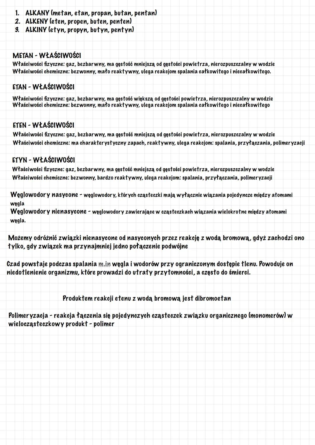 Alkany to najprostsze węglowodory nasycone. Metan i etan są gazami bezbarwnymi, nierozpuszczalnymi w wodzie. Są mało reaktywne chemicznie, ale ulegają spalaniu całkowitemu i niecałkowitemu. Podczas niecałkowitego spalania powstaje niebezpieczny czad, który może prowadzić do śmierci przez niedotlenienie organizmu.