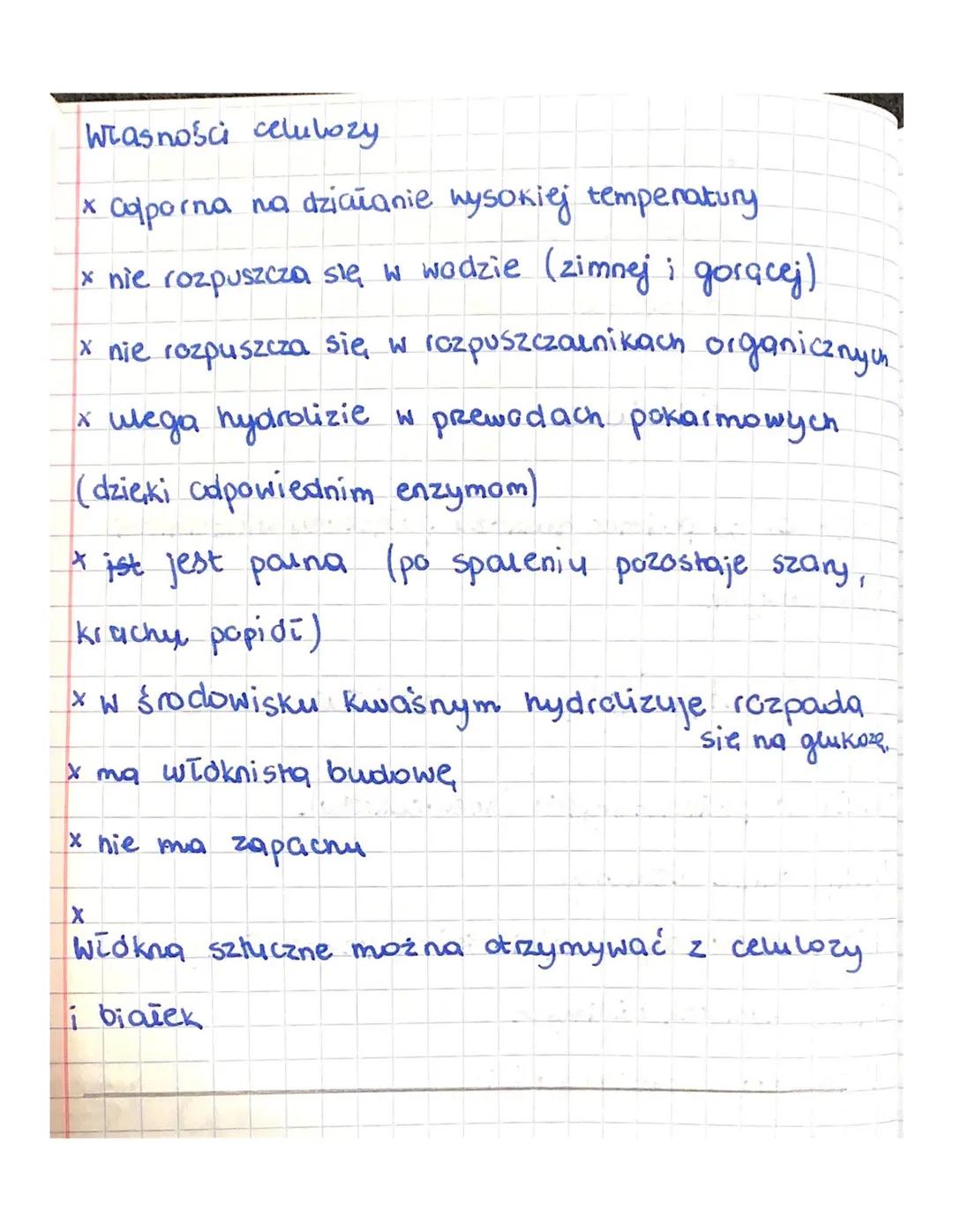Odkryj kluczowe informacje o skrobi i celulozie, ich właściwościach, procesie powstawania oraz zastosowaniach w różnych branżach. Idealne dla uczniów klasy 8, ta notatka z chemii wyjaśnia znaczenie polisacharydów w diecie i przemyśle. Zawiera wzory chemiczne oraz rolę błonnika pokarmowego.