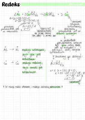 Zrozumienie reakcji redoks, w tym dysproporcjonowania i synproporcjonowania. Notatka omawia mechanizmy reakcji, obliczanie wartościowości pierwiastków oraz przykłady reakcji z użyciem HNO3 i innych reagentów. Idealna dla studentów chemii przygotowujących się do egzaminów.