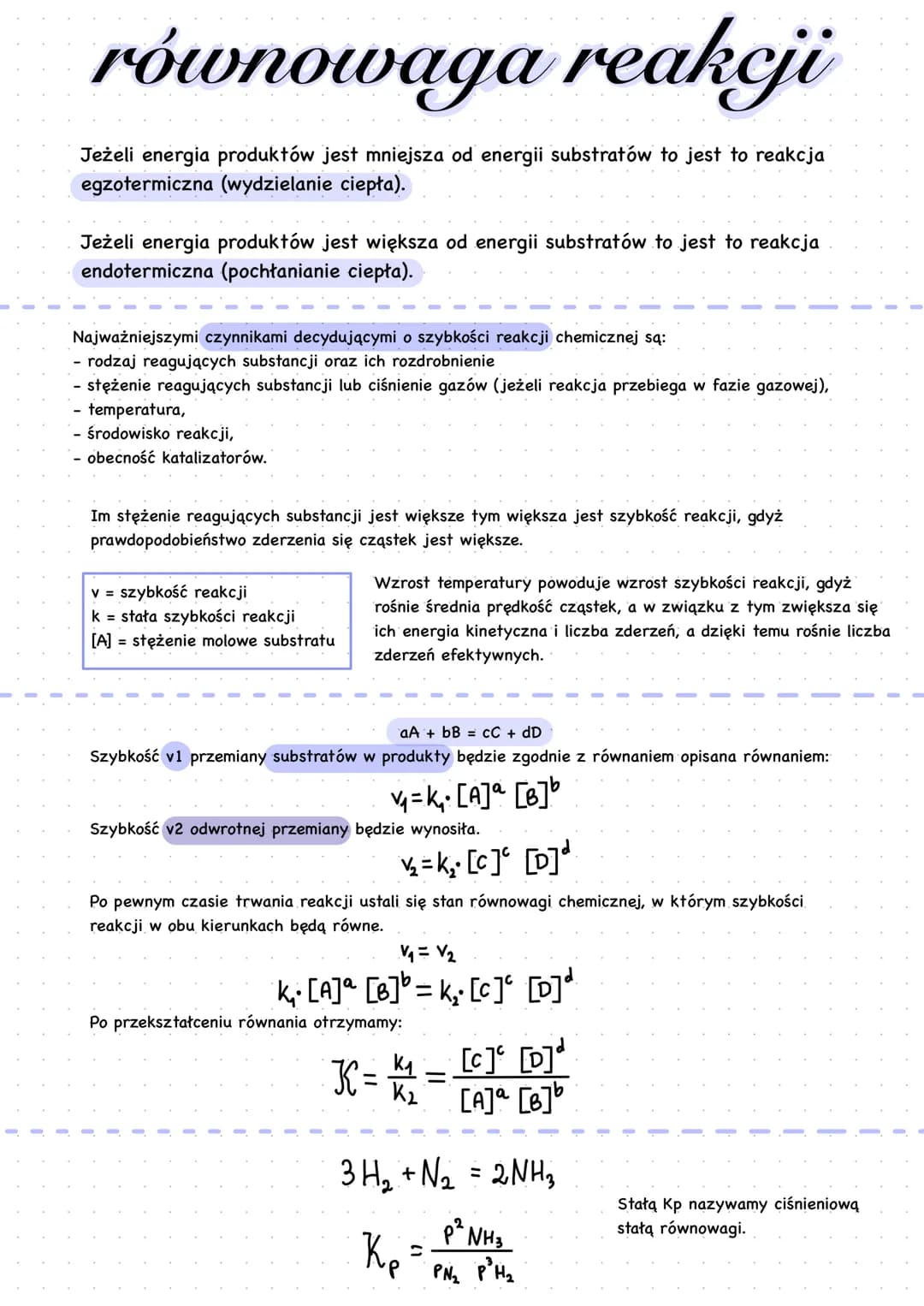 Dokument wyjaśnia także pojęcie równowagi chemicznej, przedstawiając równania dla szybkości reakcji w obu kierunkach oraz warunek równowagi. Wprowadzono pojęcie stałej równowagi chemicznej (K) i przedstawiono jej wzór dla reakcji ogólnej: