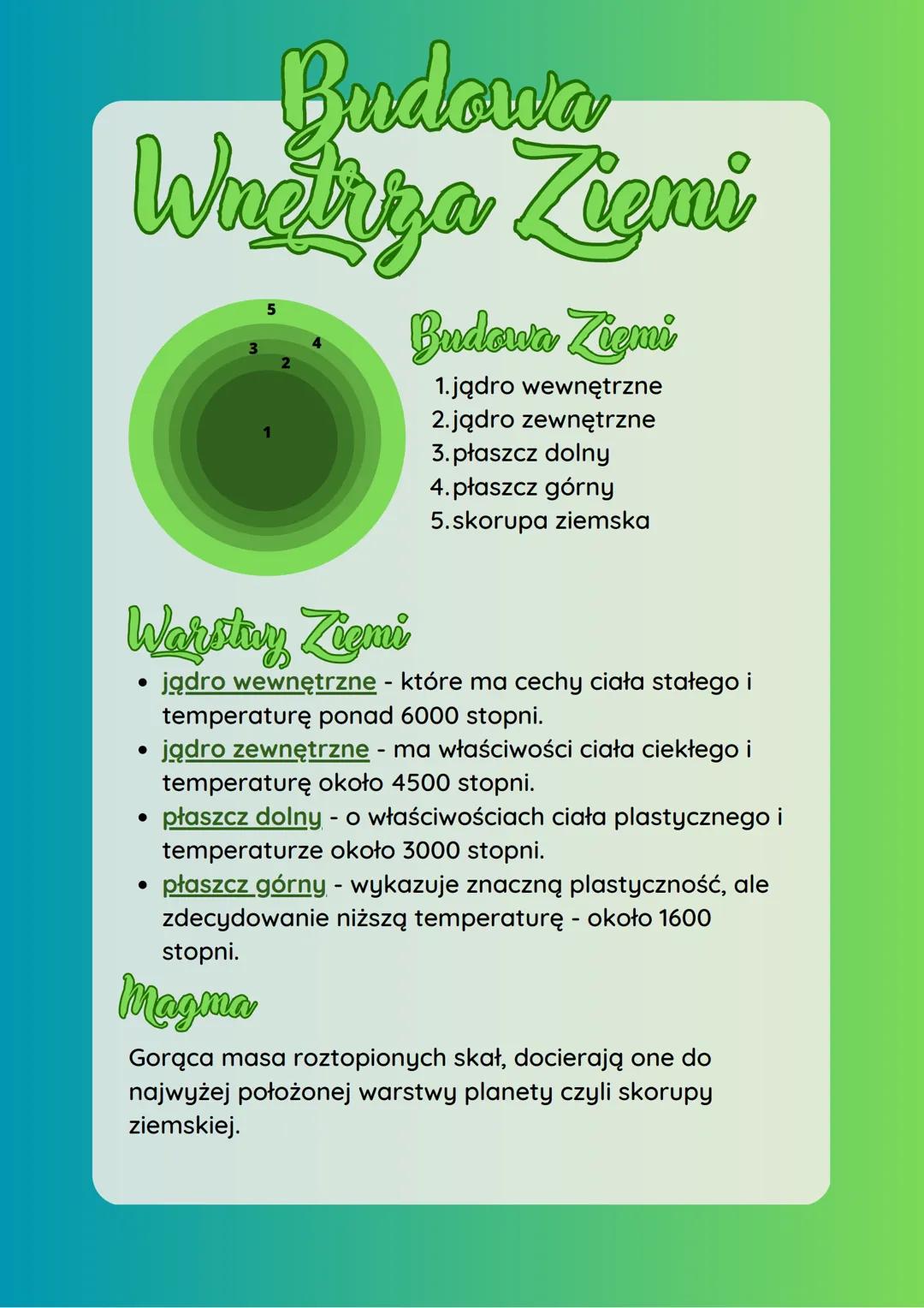 Zrozumienie budowy litosfery oraz procesów geologicznych, takich jak wulkanizm, orogeneza, wietrzenie, i działalność wód. Notatka obejmuje kluczowe pojęcia związane z minerałami, rodzajami skał, ruchami masowymi oraz erozją. Idealna dla studentów geologii i nauk przyrodniczych.