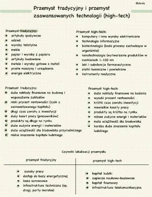 Odkryj kluczowe cechy przemysłu high-tech oraz jego wpływ na rozwój gospodarczy. Zrozum znaczenie wykwalifikowanej kadry, innowacji technologicznych i współpracy między firmami. Materiał przeznaczony dla uczniów klasy 2 geografi, obejmujący czynniki lokalizacyjne i zmiany strukturalne w gospodarce.