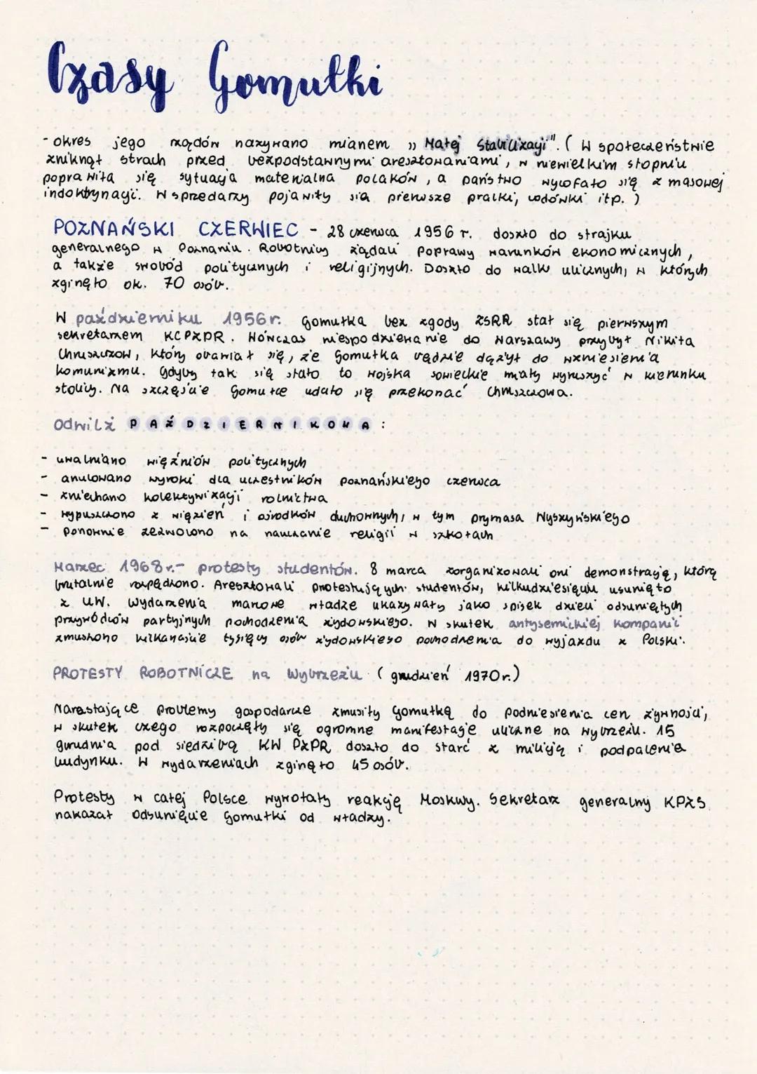 Analiza wydarzeń Polskiego Października 1956, w tym strajków robotniczych, reform Gomułki oraz zmiany w relacjach państwo-Kościół. Zawiera kluczowe informacje o sytuacji politycznej i społecznej w Polsce po śmierci Stalina. Typ: podsumowanie.