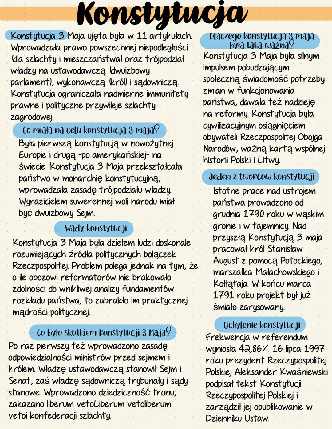 Zrozumienie Konstytucji 3 Maja (1791) i jej wpływu na Rzeczpospolitą. Analiza ustroju monarchii konstytucyjnej, zniesienie liberum veto oraz reformy wprowadzone przez Sejm Wielki. Kluczowe informacje dla uczniów klasy 6. Typ: podsumowanie.