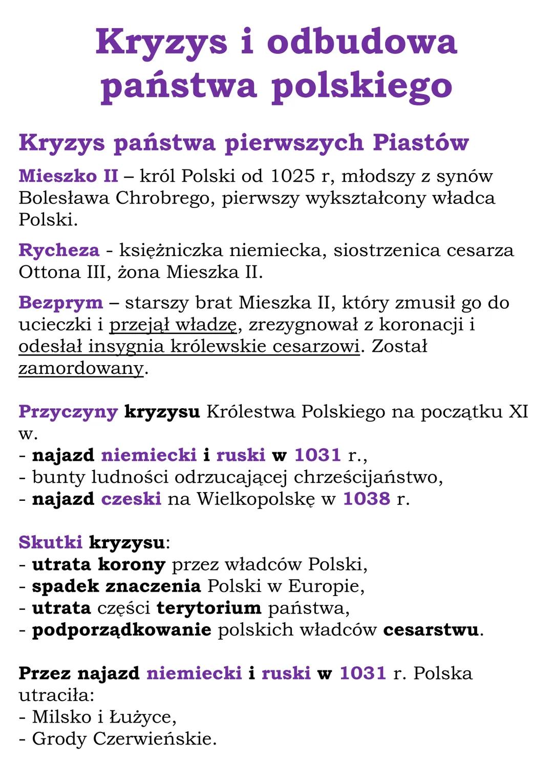 Kryzys monarchii Piastów miał kilka głównych przyczyn. W 1031 roku Polska została zaatakowana jednocześnie przez Niemcy i Ruś, tracąc ważne terytoria: Milsko, Łużyce i Grody Czerwieńskie. W kraju wybuchły bunty ludności, która chciała powrotu do pogaństwa. Na domiar złego, starszy brat Mieszka II, Bezprym, zmusił go do ucieczki i przejął władzę, odsyłając insygnia królewskie cesarzowi.