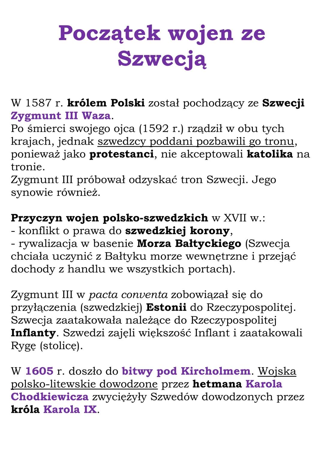 Podsumowanie kluczowych wydarzeń i zjawisk w Rzeczypospolitej w XVII wieku, w tym wojny polsko-szwedzkie, kryzys Rzeczypospolitej, powstanie Chmielnickiego oraz wpływ dynastii Wazów. Zawiera istotne daty i koncepcje, które kształtowały ten burzliwy okres w historii Polski. Typ: podsumowanie.