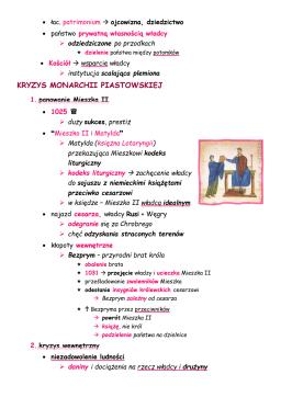 Analiza kryzysu państwa polskiego w XI wieku oraz odbudowy monarchii piastowskiej pod rządami Kazimierza Odnowiciela i Bolesława Śmiałego. Zawiera kluczowe wydarzenia, przyczyny kryzysu, reformy oraz skutki polityczne. Idealne do przygotowania się do sprawdzianu z historii Polski.