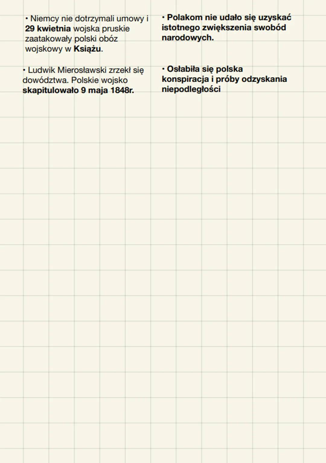 Skutki Wiosny Ludów na ziemiach polskich były jednak ograniczone. Mimo początkowych sukcesów, Niemcy nie dotrzymali umowy i 29 kwietnia wojska pruskie zaatakowały polski obóz wojskowy w Książu. Ludwik Mierosławski zrzekł się dowództwa, a polskie wojsko skapitulowało 9 maja 1848 roku.