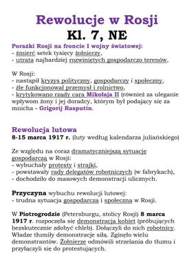 Analiza rewolucji lutowej i październikowej w Rosji, ich przyczyny, skutki oraz wpływ na powstanie Rosji Radzieckiej. Zawiera kluczowe informacje o Rządzie Tymczasowym, bolszewikach i dwuwładzy. Idealne dla uczniów 7 klasy.