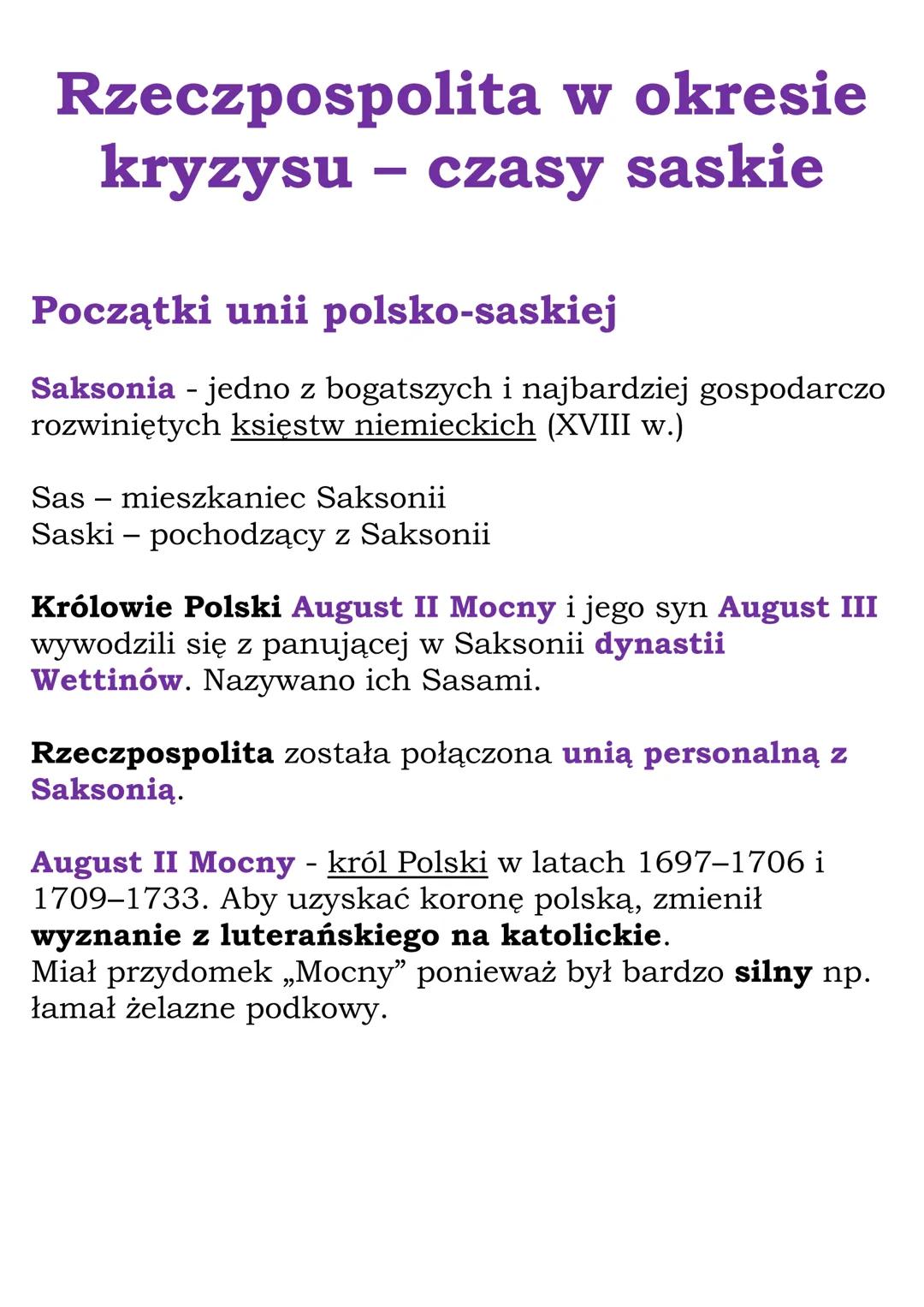 Rzeczpospolita w okresie kryzysu - czasy saskie to czas, gdy Polska została wciągnięta w wielki konflikt międzynarodowy - wojnę północną (1700-1721). August II, jako władca Saksonii, sprzymierzył się z Rosją przeciwko Szwecji, co miało fatalne skutki dla Polski.