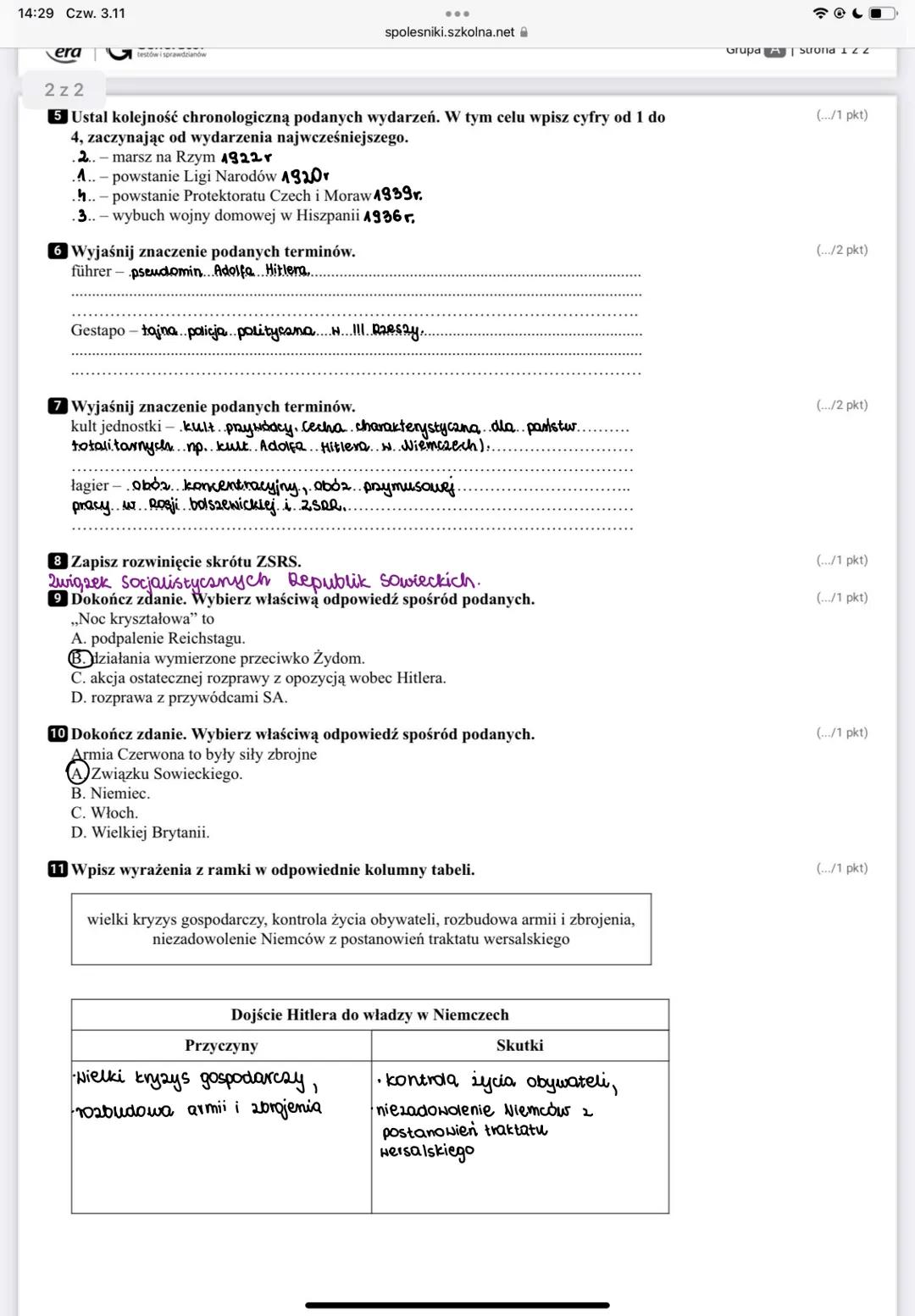 Uczniowie muszą również wykazać się znajomością skrótów i wydarzeń historycznych, takich jak ZSRS (Związek Socjalistycznych Republik Sowieckich) czy "noc kryształowa".