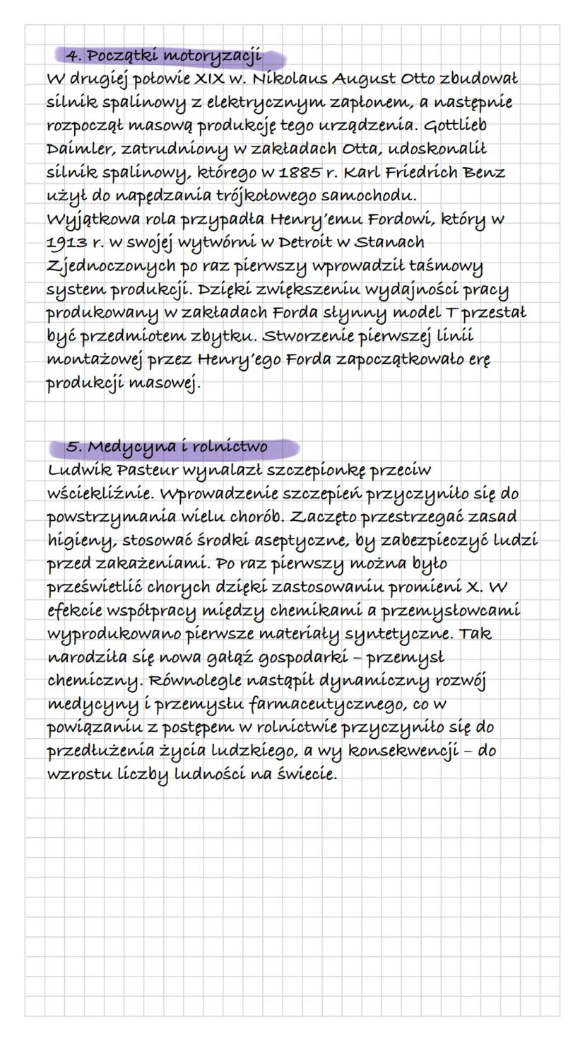W obszarze transportu, pierwszy samochód spalinowy został skonstruowany przez Karla Friedricha Benza w 1885 roku, wykorzystując silnik spalinowy udoskonalony przez Gottlieba Daimlera. Henry Ford zrewolucjonizował produkcję samochodów, wprowadzając w 1913 roku taśmowy system produkcji, co uczyniło samochody bardziej dostępnymi dla szerszej publiczności.