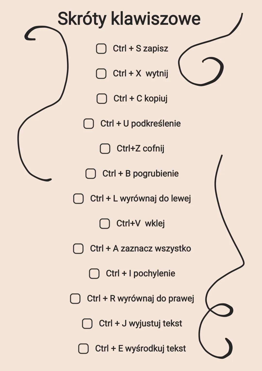 - Ctrl + X: Wycina zaznaczony fragment tekstu lub obiekt.