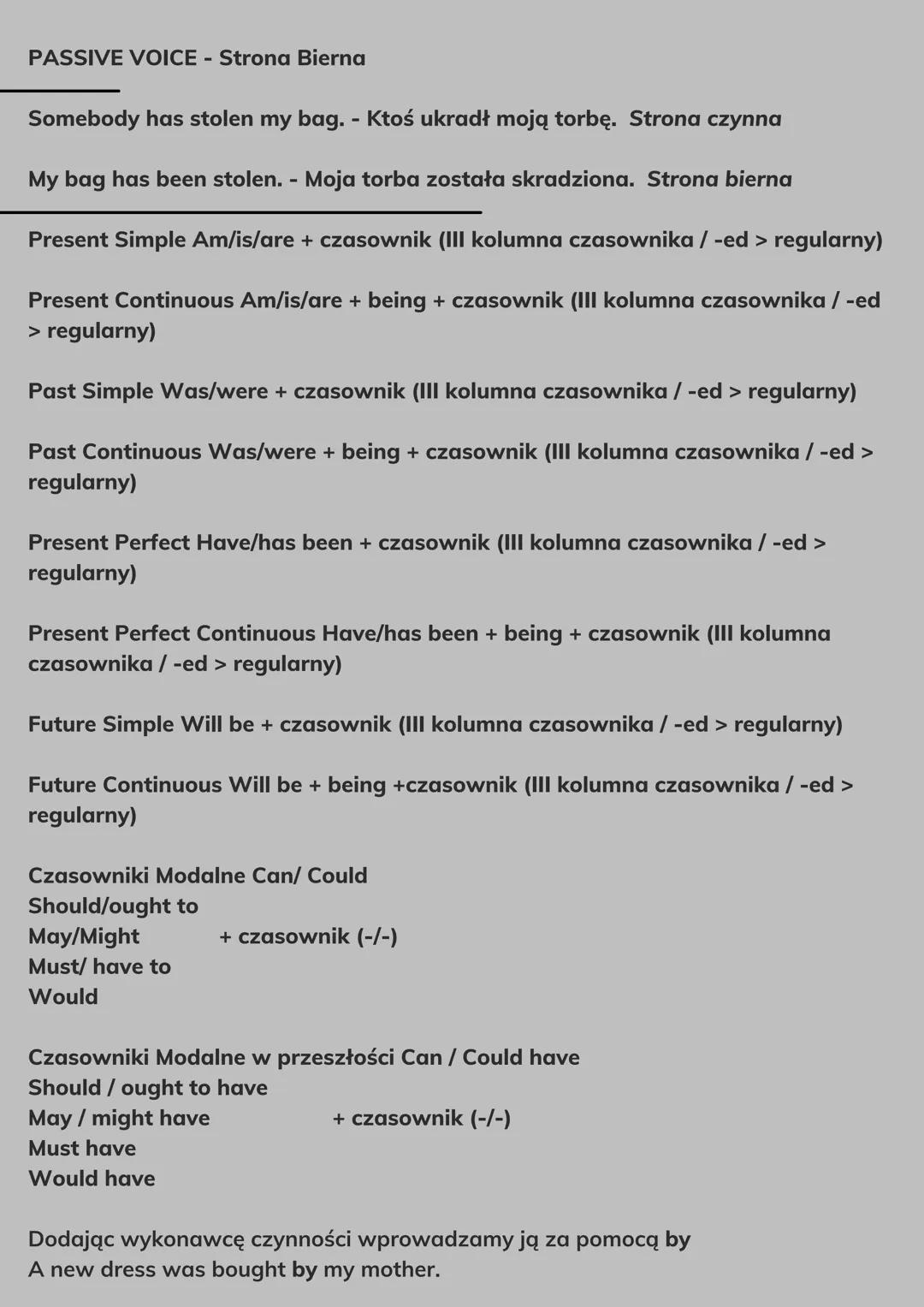 Example: "Somebody has stolen my bag." (Strona czynna) zmienia się w "My bag has been stolen." (Strona bierna)