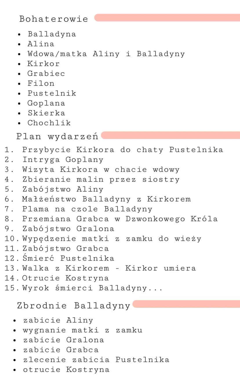 Druga strona dramatu przedstawia listę głównych bohaterów oraz szczegółowy plan wydarzeń, które składają się na fabułę "Balladyny".