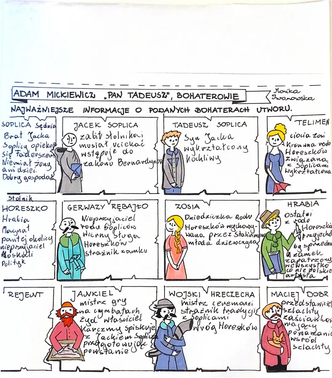 Pan Tadeusz - charakterystyka bohaterów przedstawia kluczowe postacie epopei narodowej Adama Mickiewicza. Poznajemy tu zarówno bohaterów pierwszoplanowych, jak i drugoplanowych, którzy tworzą barwny obraz polskiego społeczeństwa szlacheckiego na Litwie w latach 1811-1812.