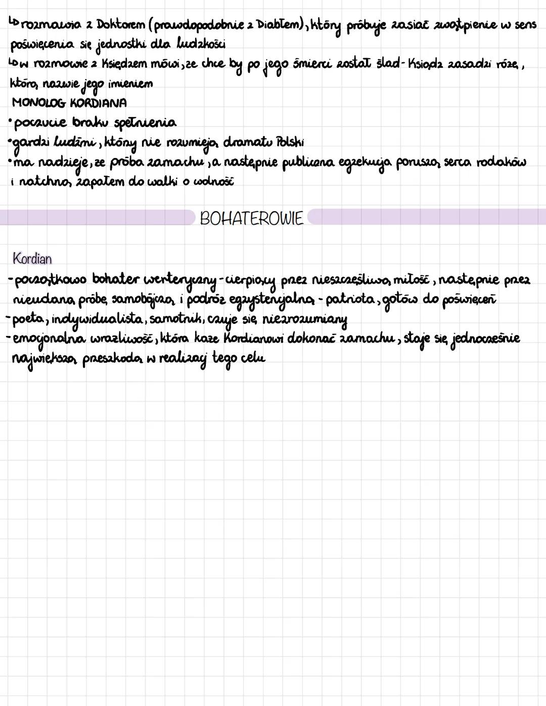 W rozmowie z Doktorem (prawdopodobnie uosobieniem Diabła) Kordian zmaga się z wątpliwościami co do sensu poświęcenia jednostki dla ludzkości. Monolog Kordiana w finale dramatu ukazuje jego rozgoryczenie i nadzieję, że jego czyn poruszy serca rodaków.