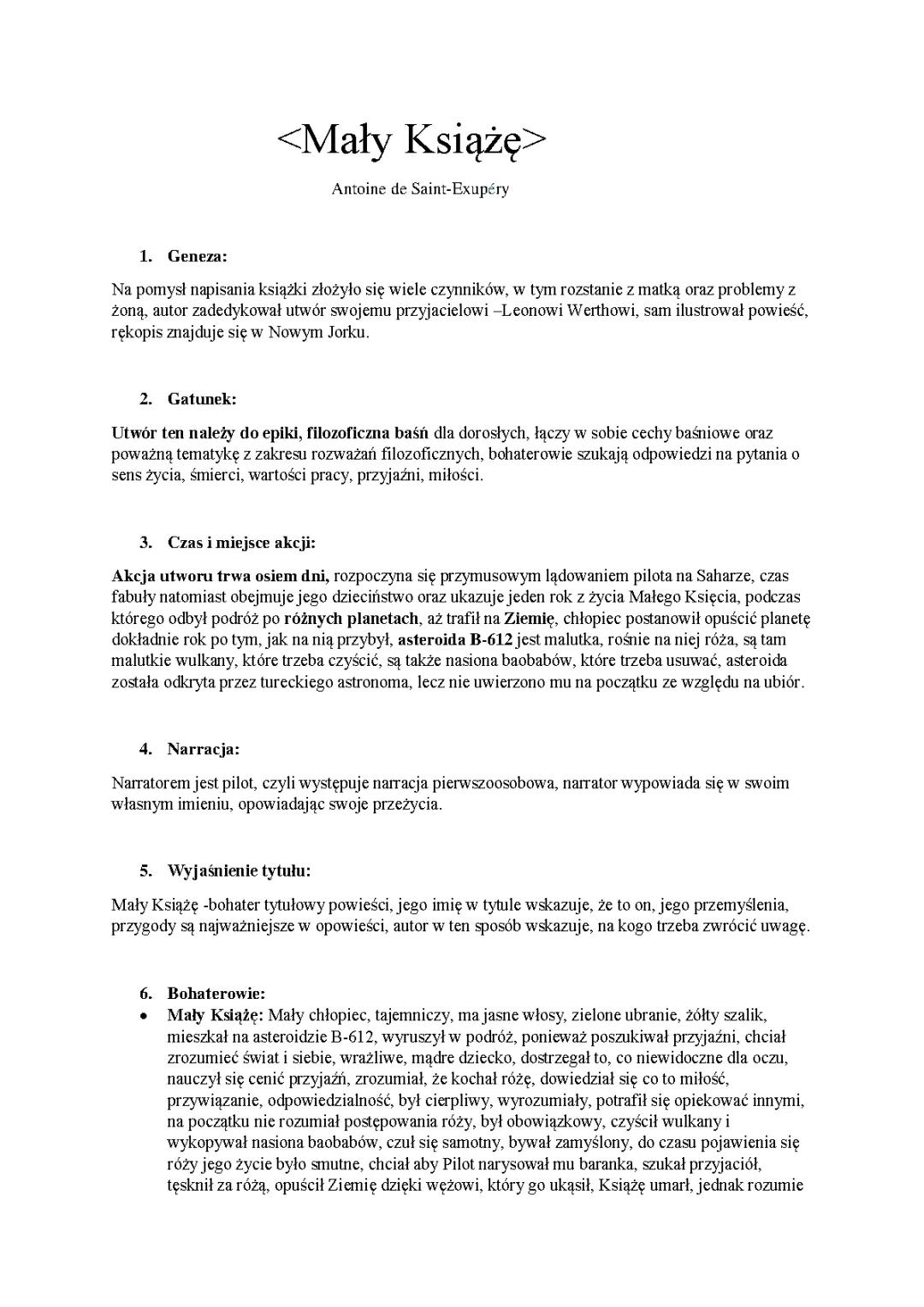 Analiza postaci Małego Księcia z lektury Antoine’a de Saint-Exupéry’ego. Odkryj cechy charakterystyczne, takie jak otwartość, ciekawość świata oraz odpowiedzialność. Zrozum, jak postrzega dorosłych i jakie wartości reprezentuje. Idealne dla uczniów przygotowujących się do lekcji lub egzaminów.