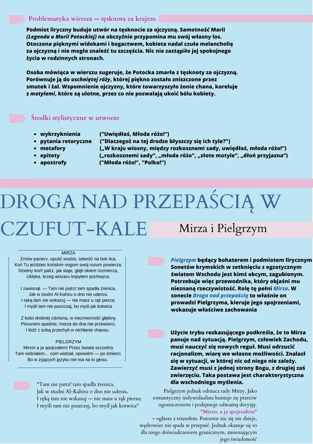 Highlight: Mickiewicz wykorzystuje legendę o Marii Potockiej jako metaforę losu polskiego wygnańca, tęskniącego za ojczyzną mimo otaczającego go piękna i bogactwa obcej ziemi.