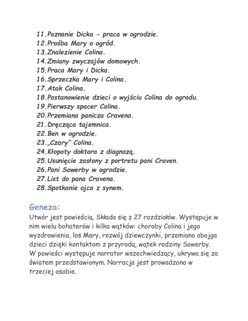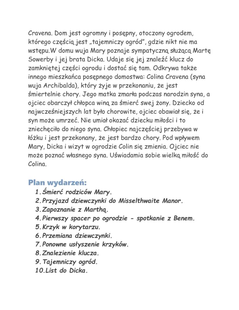 • Tajemniczy ogród - streszczenie szczegółowe przedstawia historię Mary Lennox, która po śmierci rodziców w Indiach trafia do posiadłości wuja w Anglii