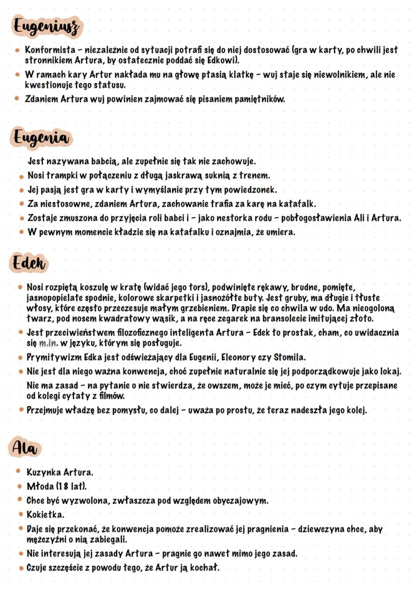 Example: W akcie II Artur próbuje narzucić ojcu rolę zdradzonego męża, a Alę przekonuje do tradycyjnego ślubu, co ilustruje jego dążenie do przywrócenia konwencjonalnych ról społecznych.