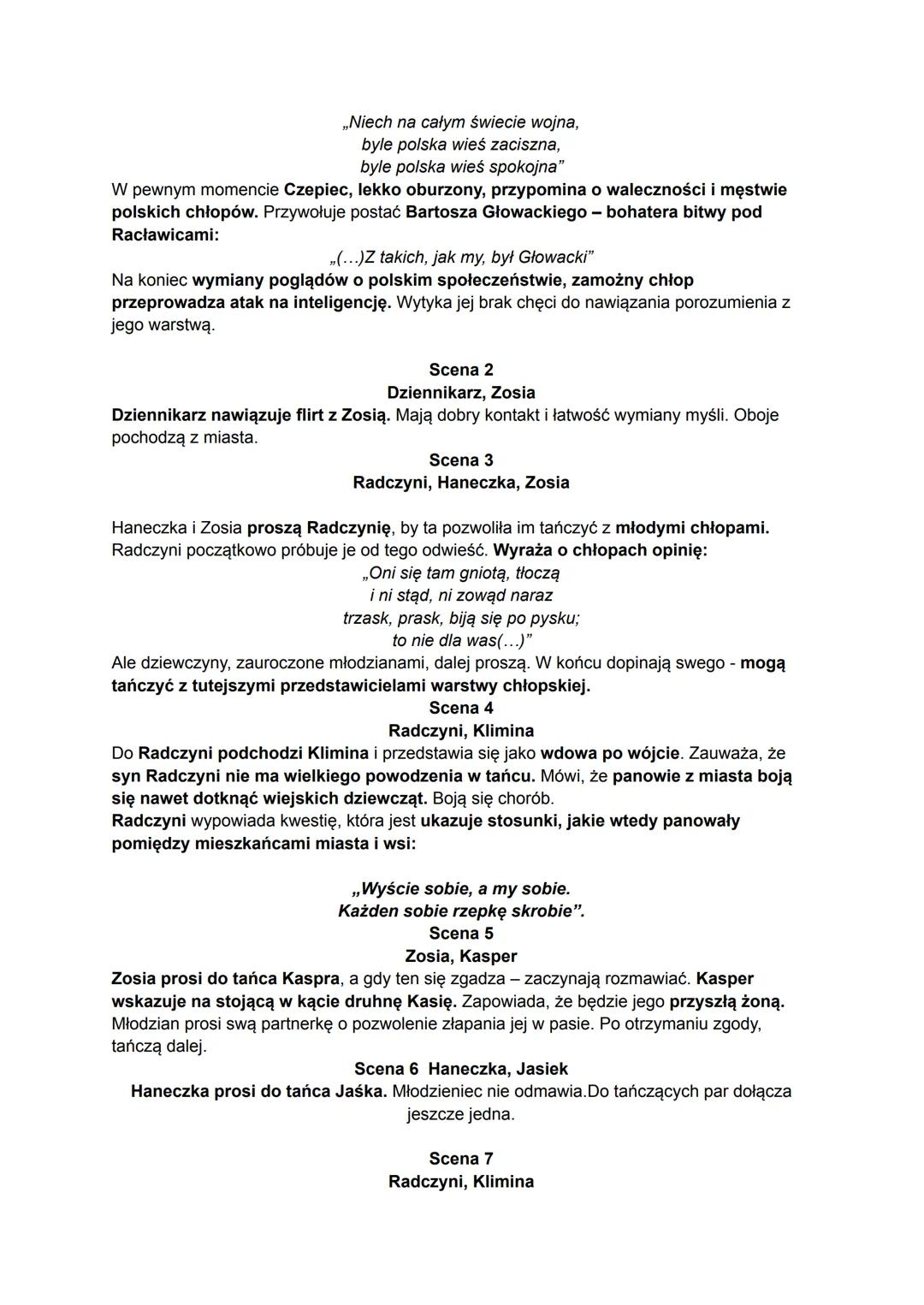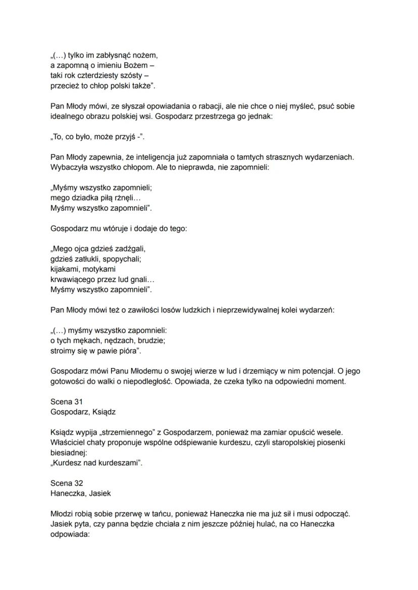 Wesele opracowanie tej części utworu skupia się na wielowymiarowej symbolice i głębokich znaczeniach ukrytych w pozornie prostych dialogach. Scena rozmowy o rabacji galicyjskiej stanowi punkt kulminacyjny w ukazywaniu przepaści między dwiema warstwami społecznymi, mimo pozorów ich zjednoczenia podczas weselnej uroczystości.