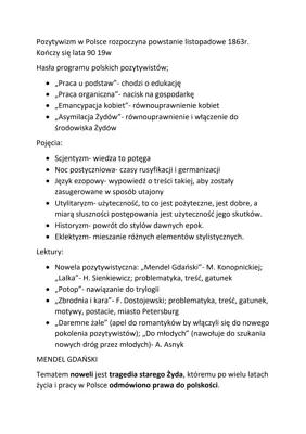 Zanurz się w istotę pozytywizmu, epoki, która zrewolucjonizowała myślenie o nauce i społeczeństwie. Ta notatka obejmuje: ramy czasowe, kluczowe wydarzenia historyczne, definicje, gatunki literackie, cechy sztuki oraz motywy w literaturze. Idealna dla studentów pragnących zrozumieć wpływ pozytywizmu na kulturę i literaturę. Przygotuj się na fascynującą podróż przez epokę pozytywizmu!