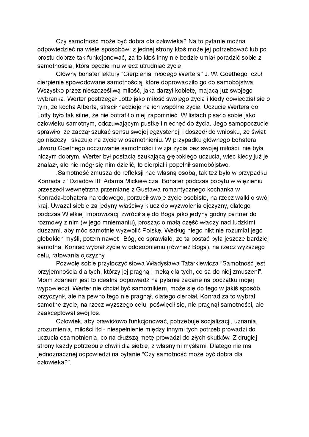Jak trafnie zauważył Władysław Tatarkiewicz: "Samotność jest przyjemnością dla tych, którzy jej pragną i męką dla tych, co są do niej zmuszeni". Werter cierpiał, bo nie pragnął życia w izolacji, podczas gdy Konrad zaakceptował swoją samotność jako niezbędny element misji, którą sobie wyznaczył.