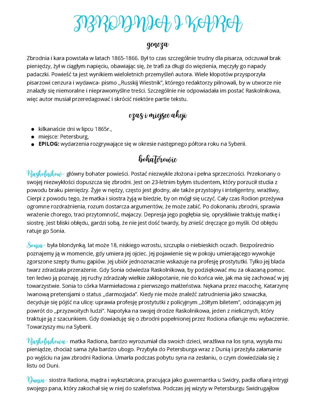 Plan wydarzeń jest logiczny: trudna sytuacja materialna prowadzi do filozofii "O zbrodni", potem przygotowania i zabójstwo Alony z siostrą. Po czym następuje choroba, rozmowy z Sonią, przyznanie się do winy i katorga.