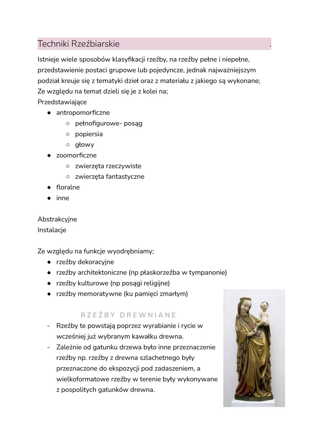 Ze względu na funkcje, rzeźby klasyfikuje się jako dekoracyjne, architektoniczne (np. płaskorzeźby w tympanonach), kulturowe (w tym religijne) oraz memoratywne. Szczególnie interesującą kategorią są rzeźby drewniane, których wykonanie wymaga specjalistycznej wiedzy o właściwościach różnych gatunków drewna. Style w malarstwie i rzeźbie często się przenikają, tworząc spójną narrację artystyczną danej epoki.
